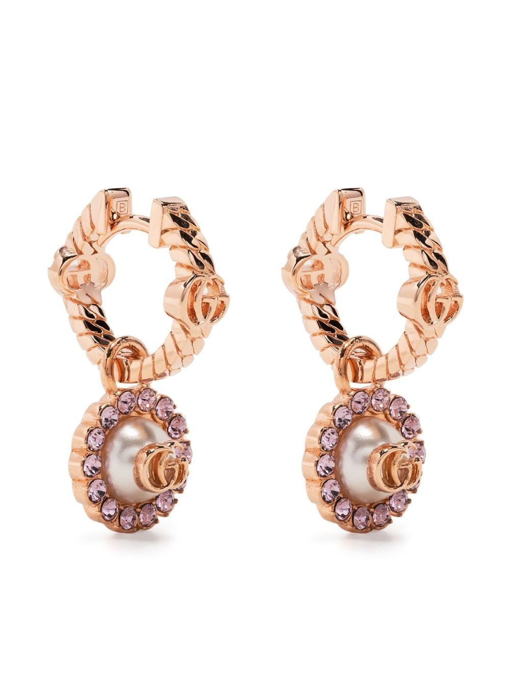 GucciOorbellen met kristalRoségoud, verguld, messing, kenmerkend GG-logo, parel hanger, verfraaid met kristallen, bedel met bloemen en kleine oorring design. Dit item wordt per paar verkocht..Land van herkomst: Italië